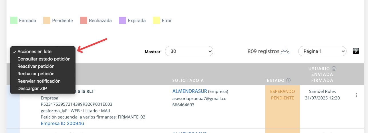 - Rojo -> Rechazada (Firmante se niega): El destinatario ha hecho clic en "Rechazar". El proceso se detiene para que puedas contactar con él y aclarar el motivo.