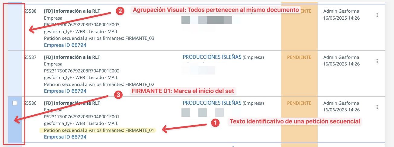Cuando un documento necesita varias firmas (ej. Gerente + RLT), el sistema los agrupa en un "Set" para que no pierdas el hilo.