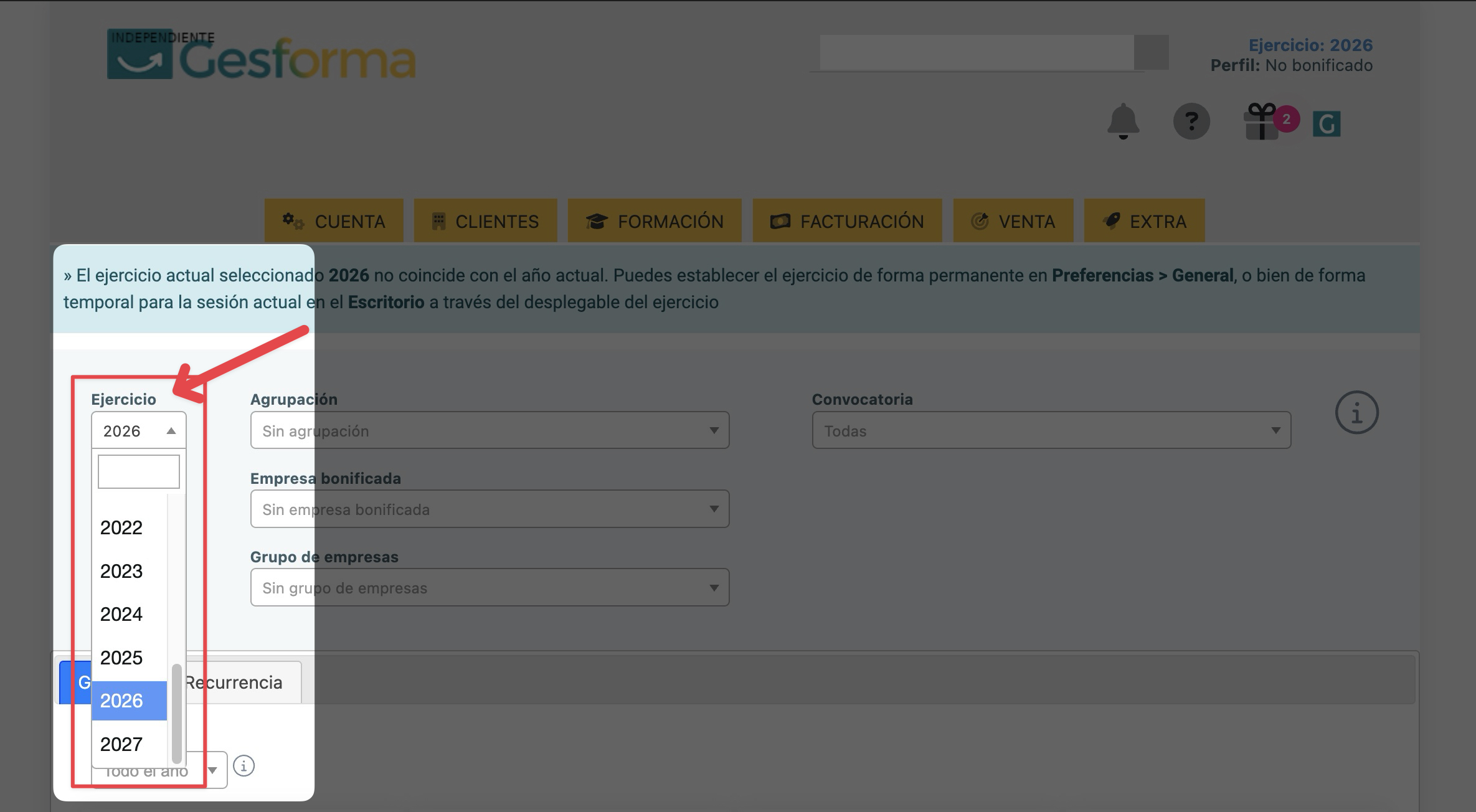 Por ejemplo si vas a preparar 2026, selecciona este año en el escritorio.